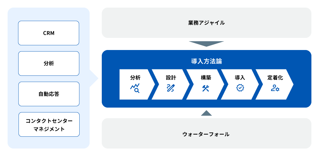 CRM、分析、自動応答、コンタクトセンターマネジメントなどの各ソリューションエリアごとに導入方法論を開発し、分析・設計・構築・導入・定着化までを強力にサポートします。業務アジャイル中心としながらも、追加開発、周辺システム連携開発に関しては、伝統的なウォーターフォール方式も取り入れています。