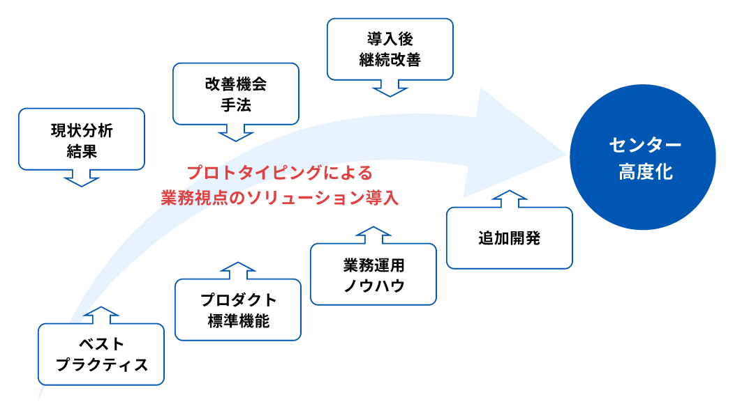 プロダクト(主にクラウド)の潜在力を最大限に発揮させるため、高度化のイメージを持てないクライアント企業をガイドしながらプロトタイプを構築。討議によって改善を繰り返すことで、目指すべきシステム導入を実現する手法です。導入知見や、当社オペレーションの活用方法を徹底的にベンチマークすることで、より業務に即した導入が可能になります。