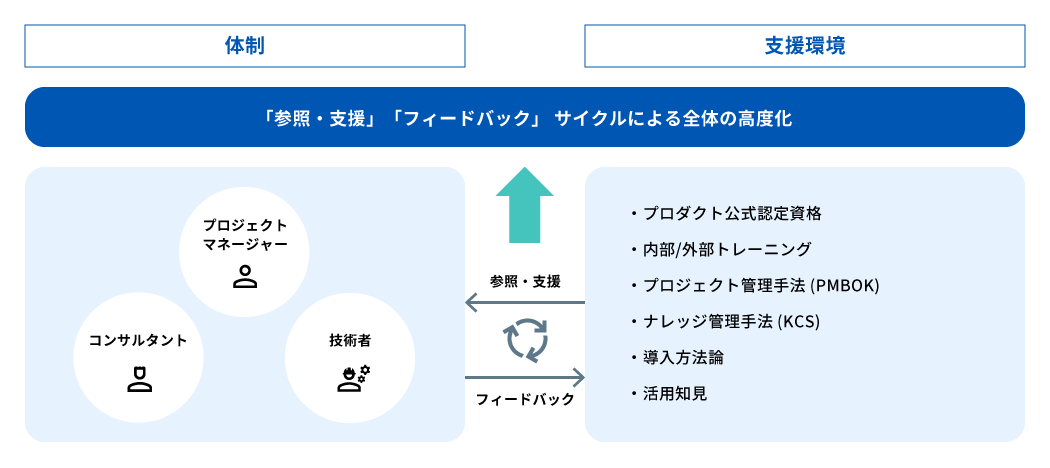 方法論にもとづき、業務アジャイル方式を効果的に実現するために、各ソリューション領域で、業務とプロダクトに精通したコンサルタント、プロジェクトマネージャー、技術者、開発者を多数有します。プロダクトに応じた公式認定資格、業界標準プロジェクト管理のPMBOK、ナレッジ管理のKCS、プロセス表記手法のBPMNなども基本スキルとして備えています。